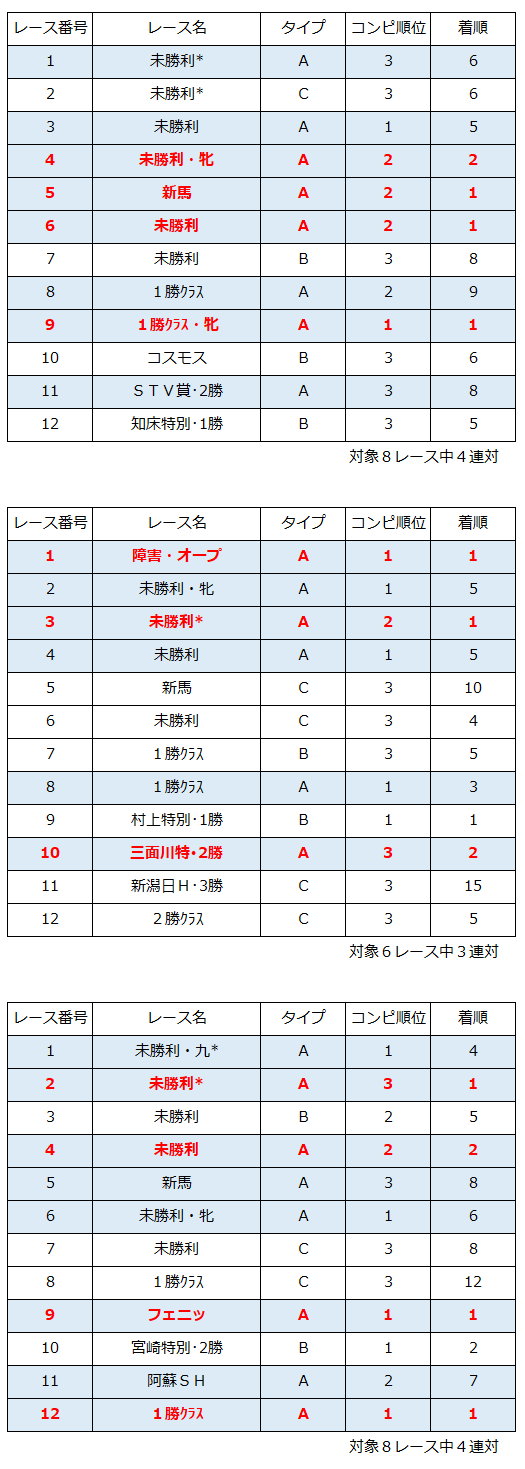 コンピ1位、2位、3位が混ざっているのに、連対率50%をキープしている。