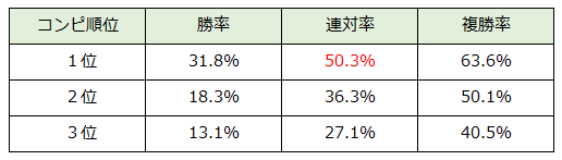 ちなみにコンピ指数順位別の成績は上記の通りです。
