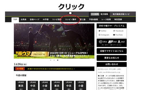コンピ×騎手を閲覧するには、極ウマ・プレミアムにログインし、画面上部の「コンピ×騎手」をクリックすると、各レースごとに判定結果が表示される仕組み。