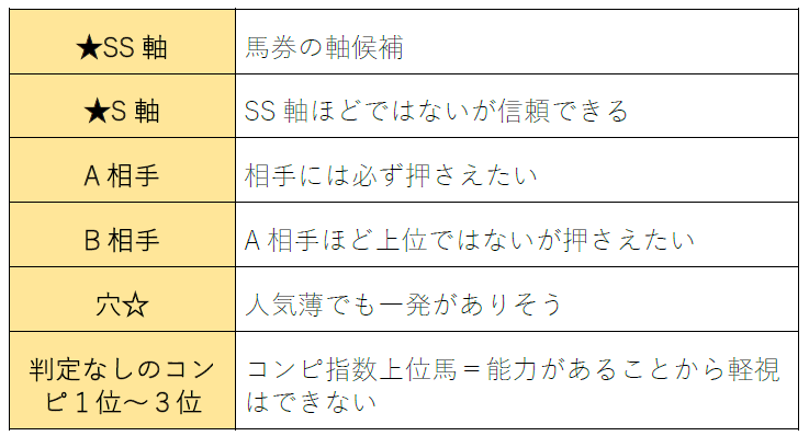 具体的には★SS軸・★S軸・A相手・B相手・穴☆の5段階評価で出馬表に表示されます。