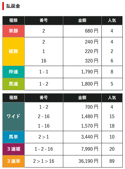 2着は◎の①ディヴィーナ、3着はノーマークの⑯ラインベックでしたが、馬連なら本線で的中!