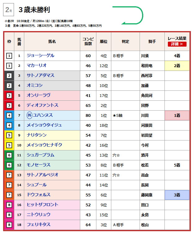 直線予想は各レースの約30分前に公開と、レース直前まで分からないので、個人的にはかなり使い勝手が悪いと考えています。
